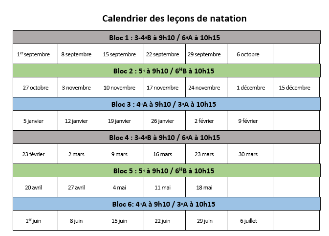 Les leçons de natation sont données par un enseignant de natation accompagné du titulaire de classe à la piscine du Stavia, à Estavayer-le-Lac. Elles se déroulent le lundi matin par blocs de 4 à 8 semaines et concernent les classes de 3H à 6H (voir le calendrier ci-après). Lorsque les classes se rendent à la natation, la grande leçon de gym est annulée. Si le cours de natation a lieu en fin de matinée, les élèves qui habitent à Châbles descendent du bus à l’école de Châbles à 11h53 (sauf s’ils se rendent à l’AeS ou chez une maman de jour à Cheyres). Ils sont alors sous la responsabilité de leurs parents dès ce moment.