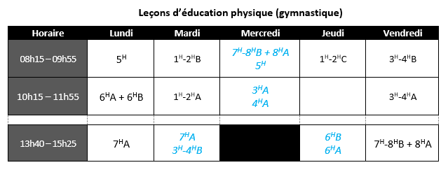 Une tenue de sport adaptée est exigée. Dès la 3H, les élèves doivent disposer de chaussures à semelles dures (baskets) ne marquant pas le sol. Pour des raisons pratiques, les enfants de 1H à 4H viennent à l’école en tenue de gymnastique le jour où ils ont cette discipline à leur programme.